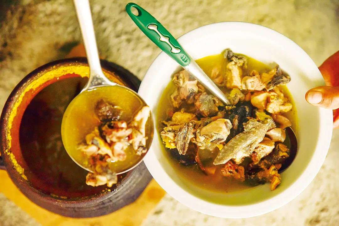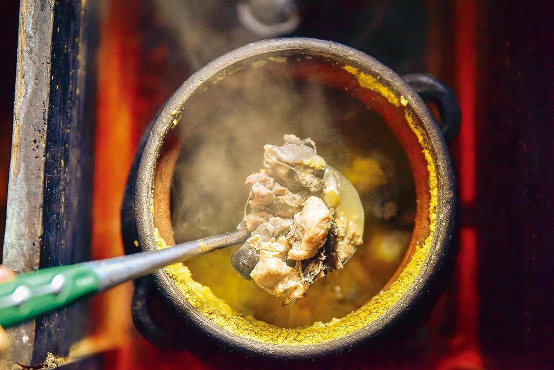 “?!?,早晨6點(diǎn)開(kāi)始燉的雞,到正午12點(diǎn)多,熟得剛剛好。油燈燉雞在烹煮過(guò)程中必須全程密封,時(shí)間到了,去除密封使用的玉米面,揭開(kāi)蓋子,香氣四溢。蓋子一旦打開(kāi),無(wú)法回爐再造,這就要求手藝人對(duì)火候、時(shí)間把握精準(zhǔn)。土罐最上面飄著薄薄一層淡黃色的油,這是土雞油和香果油的混合物,把油蕩開(kāi),盛一碗清湯緩緩下肚,味道十分醇厚,帶著土雞特有的鮮甜。兩年的母雞在杜成興眼中還不算老,6小時(shí)的小火細(xì)煨,似乎把雞肉的所有香氣都貫通了,雞肉依舊緊緊附著在骨頭上,用牙齒把肉從骨頭上剔下來(lái),反復(fù)咀嚼,越嚼越香。